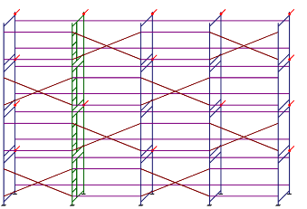 Рама с лестницей - 4 шт., Рама проходная - 16 шт., Связь диагональная 2м - 8 шт., Связь горизонтальная 2 м - 48 шт., Опора простая - 10 шт., Кронштейн 270 мм - 8 шт., Настил металлический 2м - 4 шт.